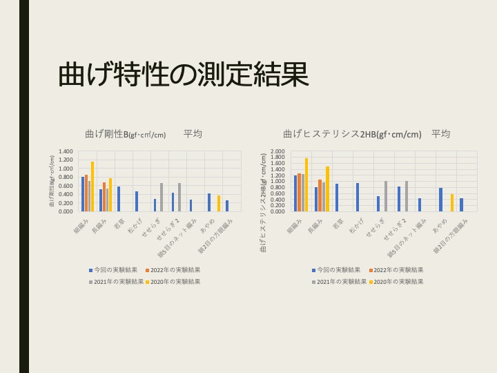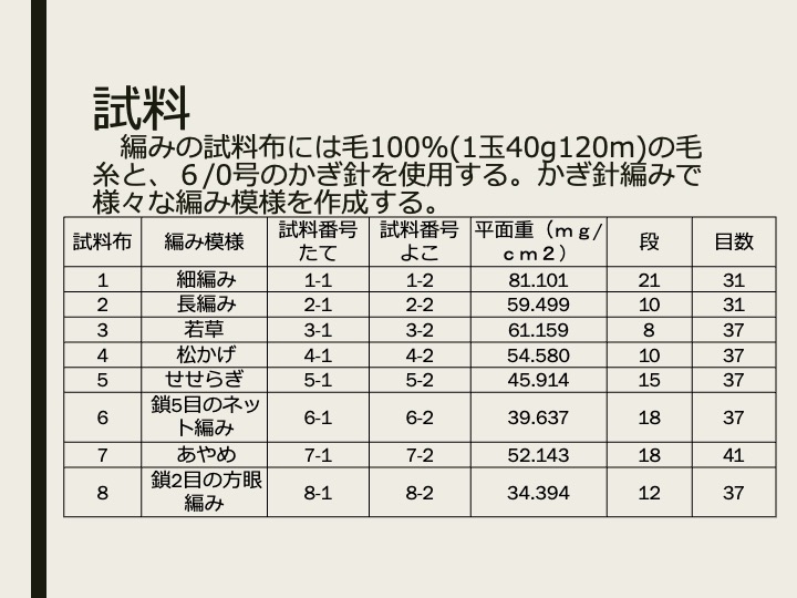 本制作では、そのかぎ針編みを使用して子供服の制作を行うことを目的とする。制作を行うにあたって、まず基本となる細編み、長編みに加え、さまざまな編み模様を6種類作成し、曲げ特性と接触冷温感の実験を行い、相違を比較検討した。実験結果から子供服に合う編み模様を選定し、子供が着用しやすいワンピースの制作を行うことにした。