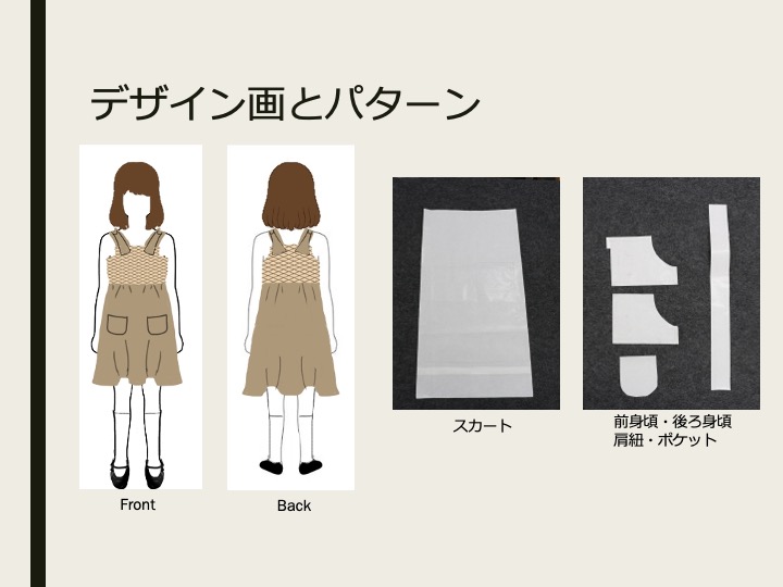 作品概要(かぎ針編みを用いた子供用ワンピース(110㎝))、主な材料(綿100%の布、毛100%の糸)、作品論文、パネル、梗概