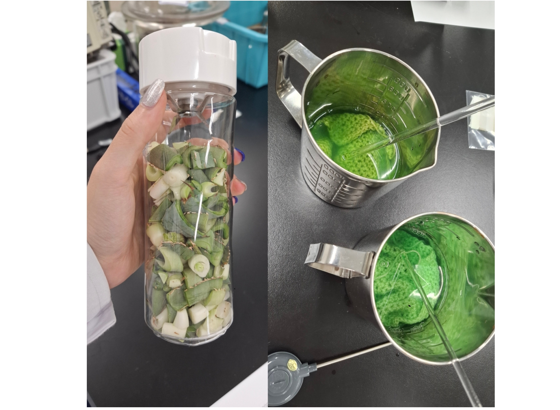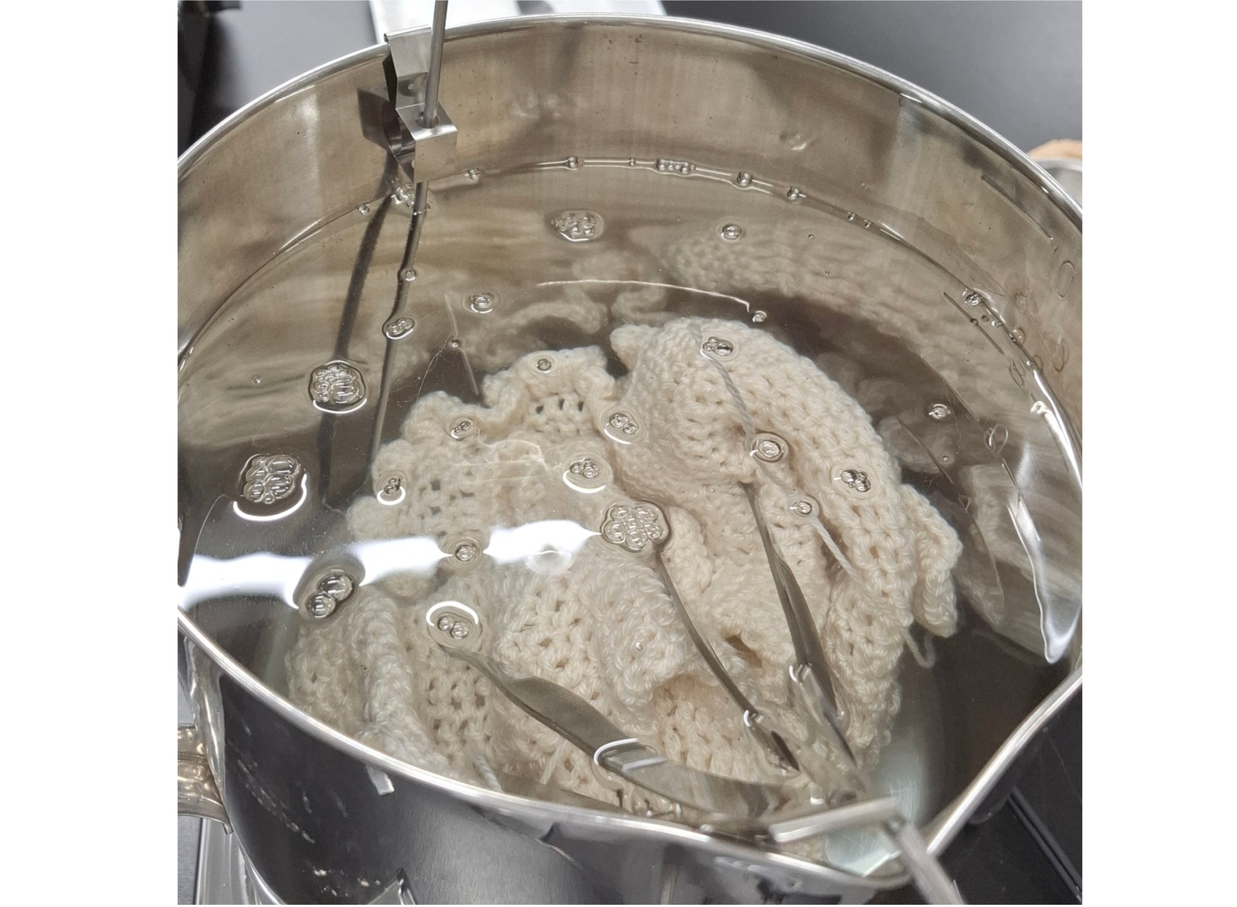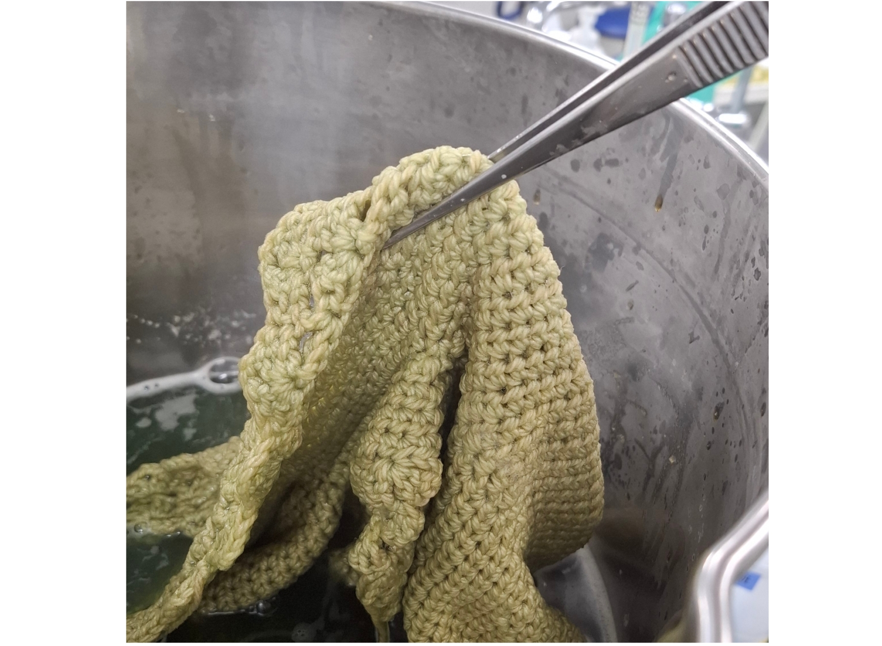 廃棄されたアガベを用いて、綿糸で制作したニット製品の染色を行いました。アガベを染色材料に用いたというデータは見つからず、染色できるか分からず不安でした。実験を重ね、綺麗な緑に染色することができ、納得いく作品を制作することができました。学生最後に挑戦することができ、とてもいい経験になりました。