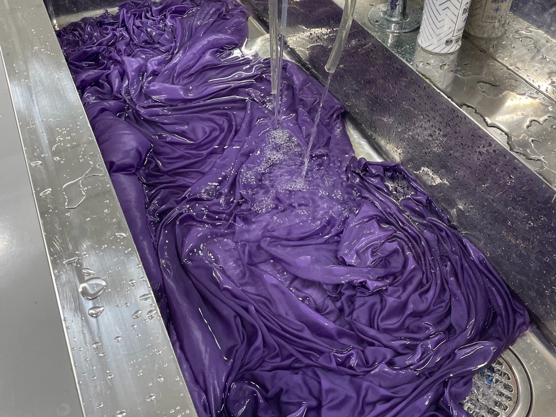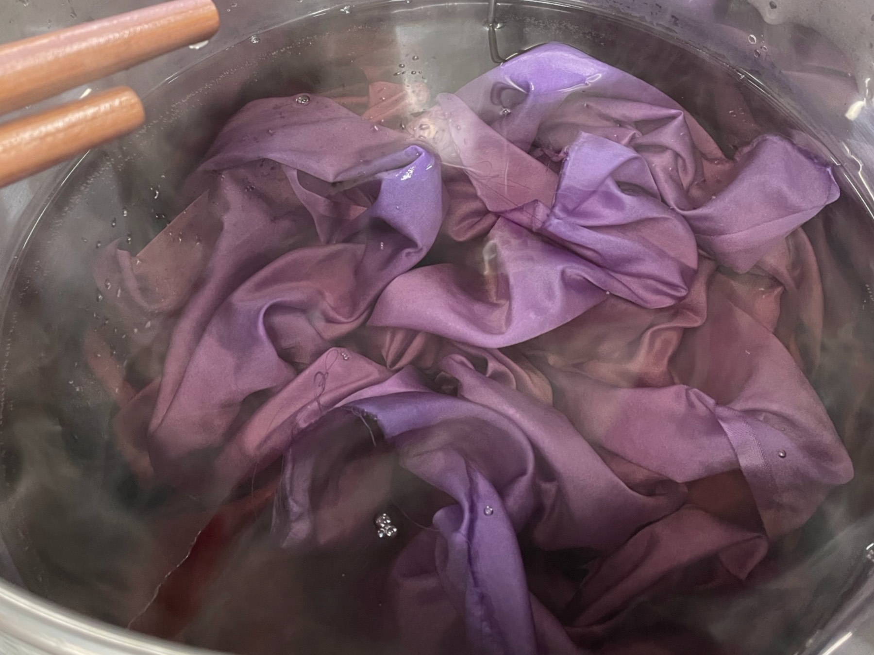 天然染料による紫の表現力に着目し、理想とする色味の再現と、その色を最大限に活かすドレス制作に取り組んだ。ログウッドを用いた濃度実験を重ね、素材ごとの発色や光沢の違いを比較検討しながら最適な紫を追求した。さらに、三層構造を採用することで奥行きのある立体的なシルエットを実現し、統一感のある上品な紫の世界観を表現した。