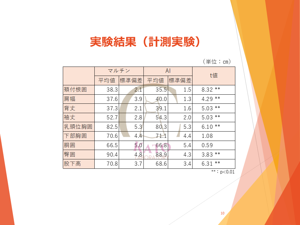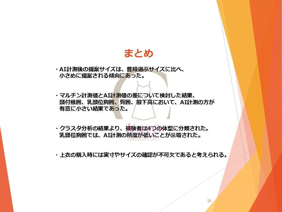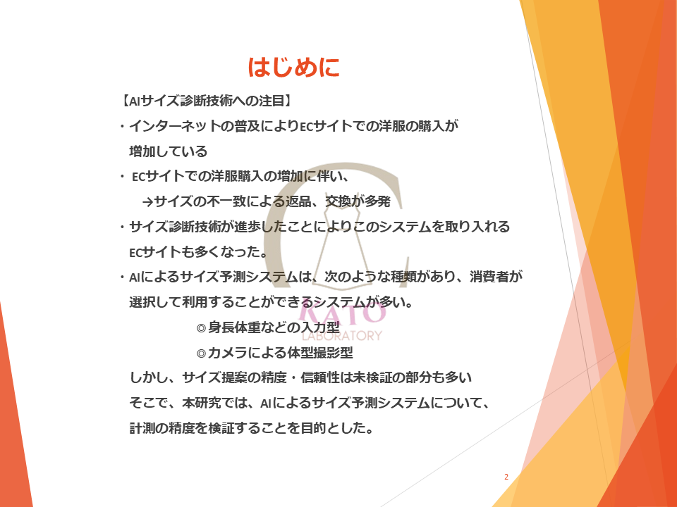 近年では、ファッションECサイトが普及しているが、試着ができないことでのサイズミスマッチが課題とされている。この課題を解決するために近年注目されているのが、AIを用いたサイズ診断システムである。しかし現状では、診断結果の精度や有効性に関する検証は十分ではない。そこで本研究では、AI人体計測結果とマルチン人体計測結果の比較、検証を行った。