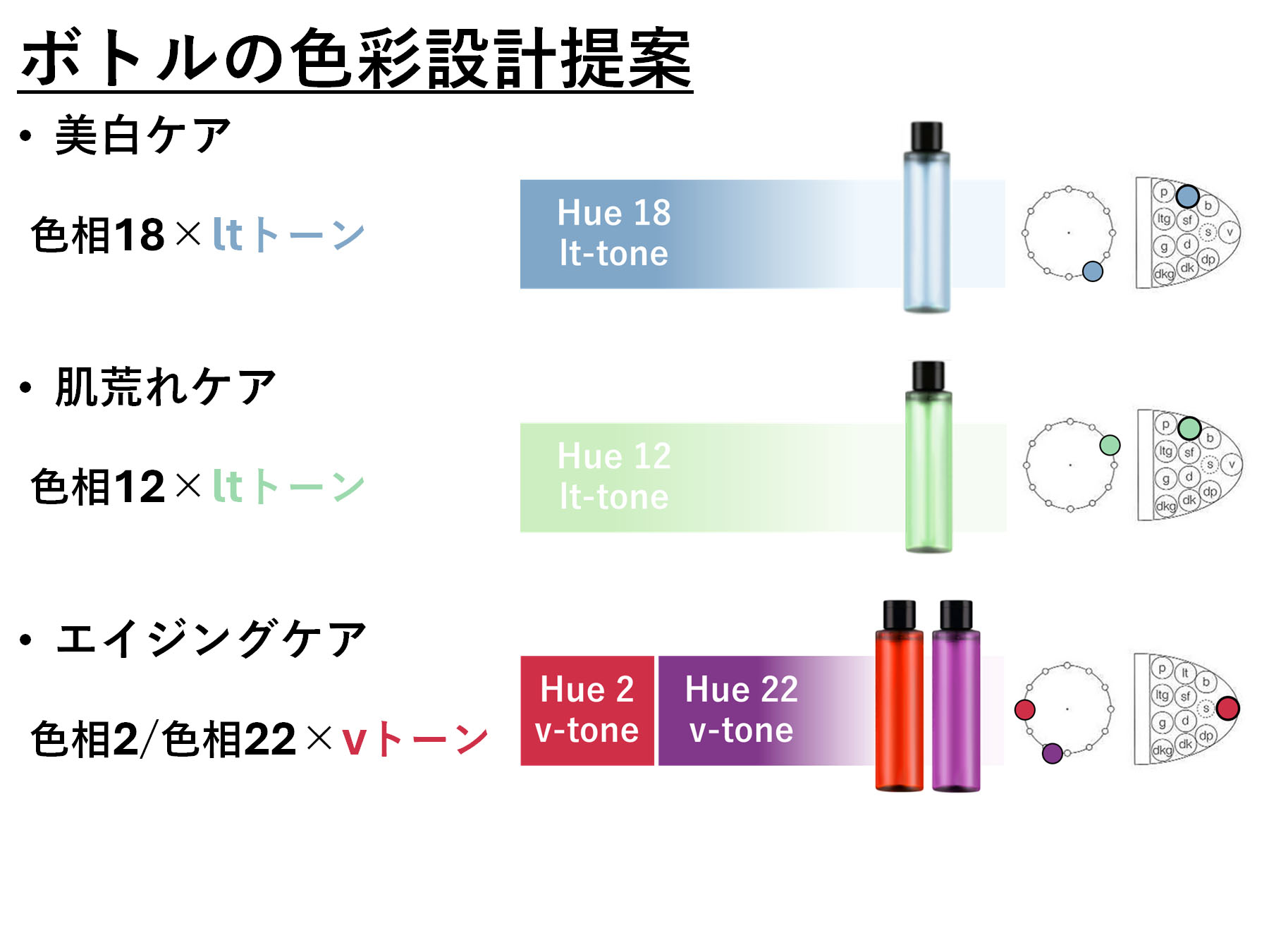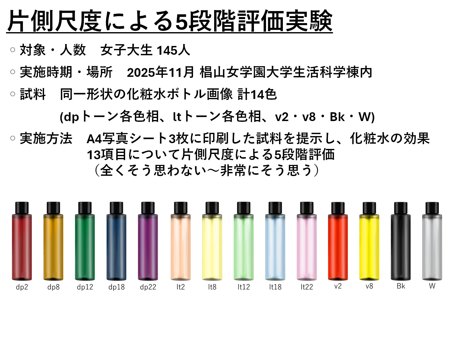 近年、化粧水市場では美白や肌荒れケア、エイジングケアなど、効果の異なる製品が数多く展開されている。消費者は、成分表示だけでなくボトルデザインから効果を直感的に判断し、商品選択の手がかりとしている。特にオンライン購入の普及により、実際に使用感を確かめられない状況では、視覚情報の重要性が高まっている。本研究では、化粧水ボトルの色彩に着目し、色相・トーンが効果イメージの捉え方に及ぼす影響を検討した。得られた知見は、効果とデザインの一致感を高める化粧水の設計に活用できると考えられる。