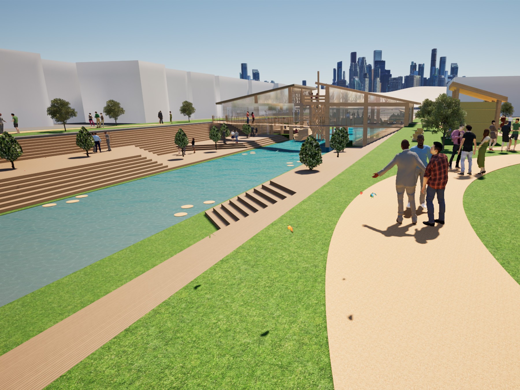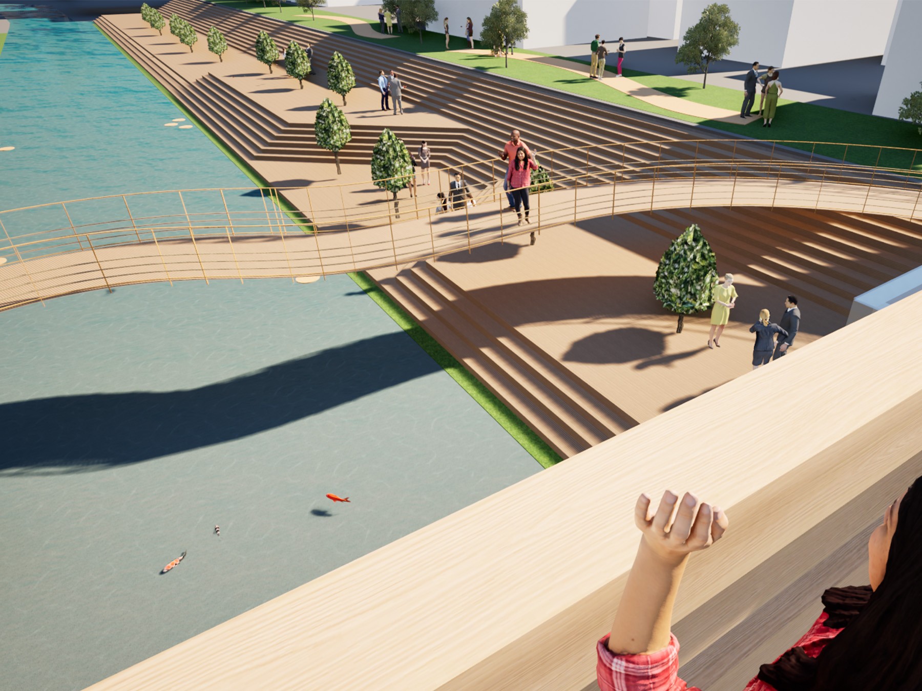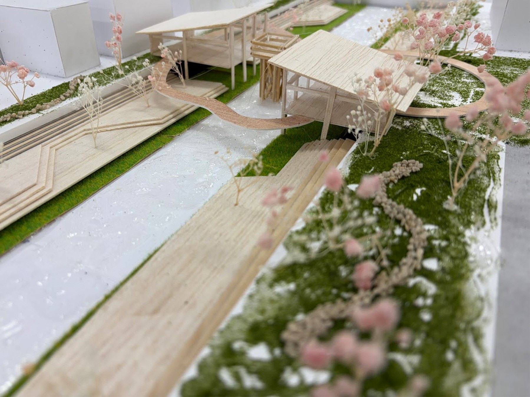 「祭り」を日常の中に組み込み、都市水辺空間の親水性向上を目的とする。対象地は大垣市中心部の水門川沿いとし、回遊・滞留を生む橋や動線を重ね合わせることで、日常利用と祭り利用が読み替え可能な空間を計画した。太鼓櫓や提灯といった祭りの要素を建築化し、「見る/見られる」関係を生む立体的な構成によって、通年で人の関係性とにぎわいが生まれる河川空間のあり方を提案する。