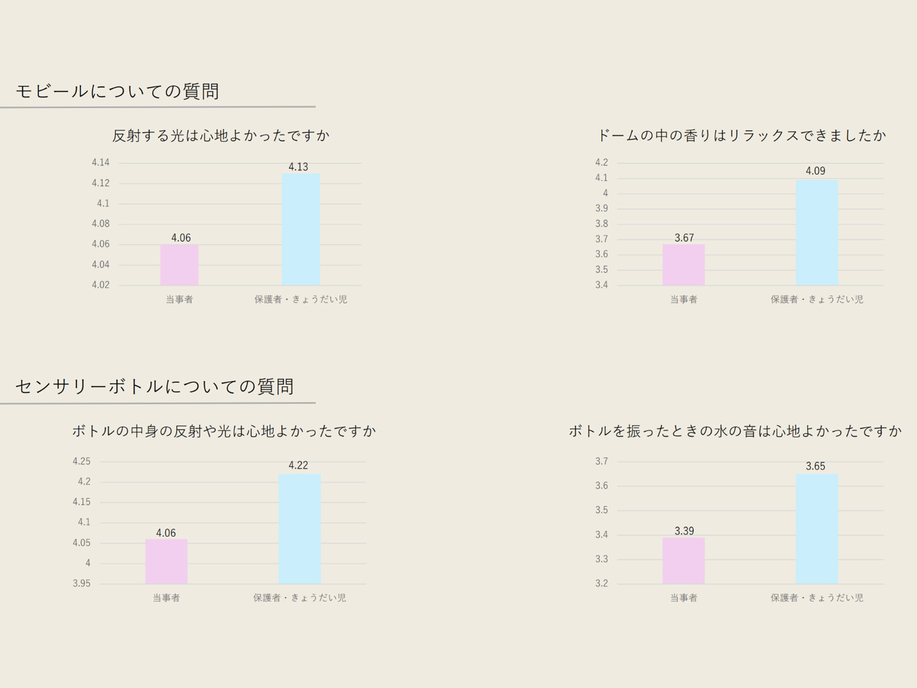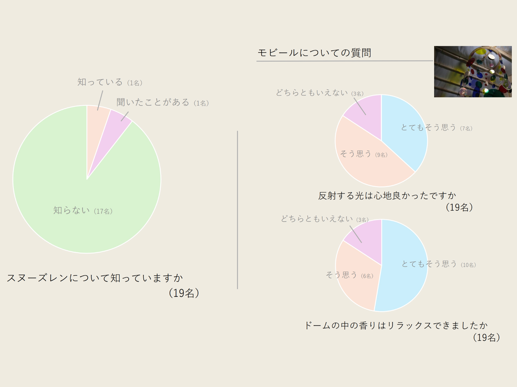 スヌーズレンドームをさまざまな人に 実際に体験してもらい、認知度の向上と リラックス効果を検証した。体験を通してより多くの人に知ってもらうきっかけ となることを目指し、スヌーズレンの可能性を広げることも目的とした。体験者 の反応や評価をもとに、今後の活用について考察する。