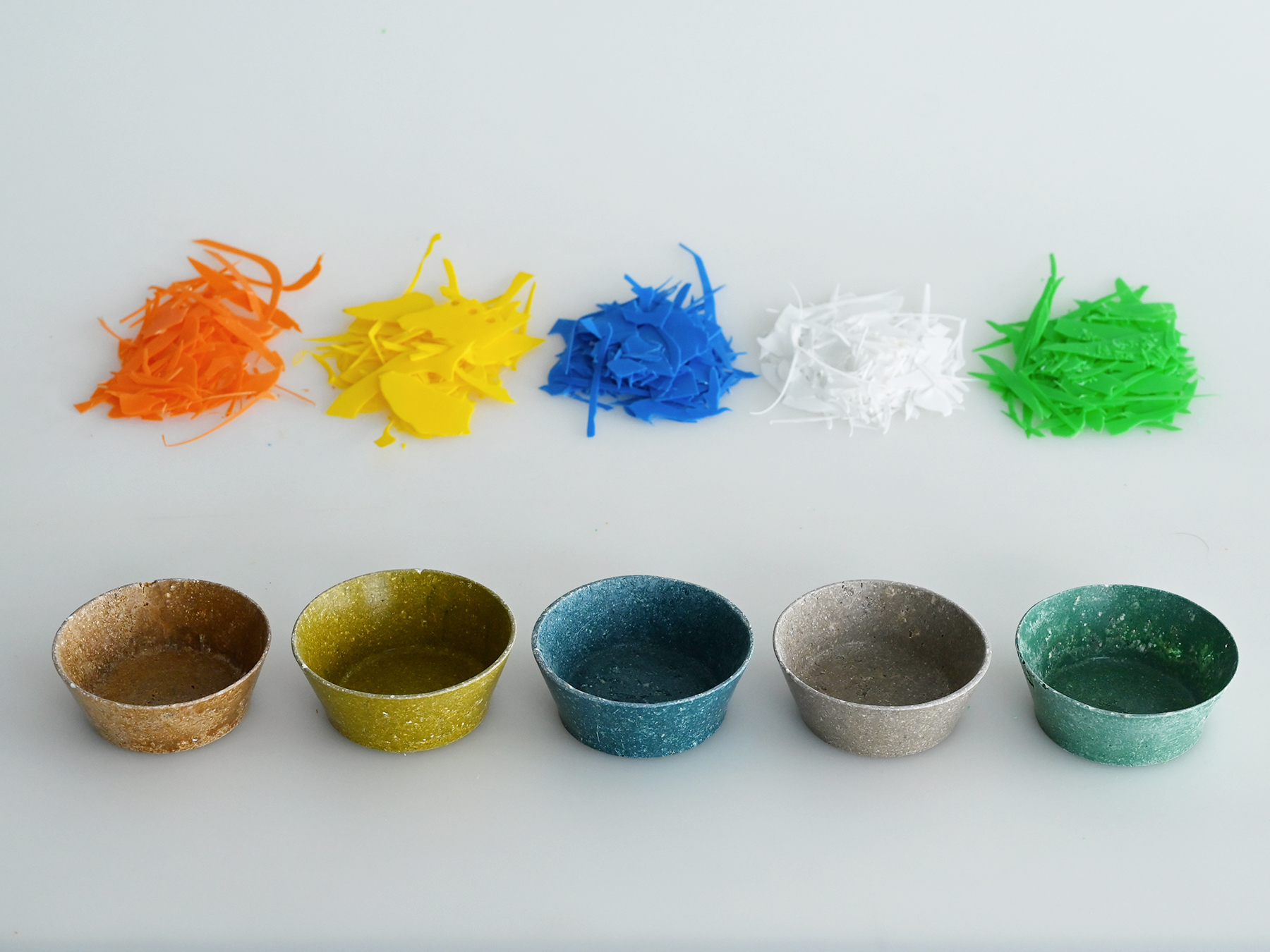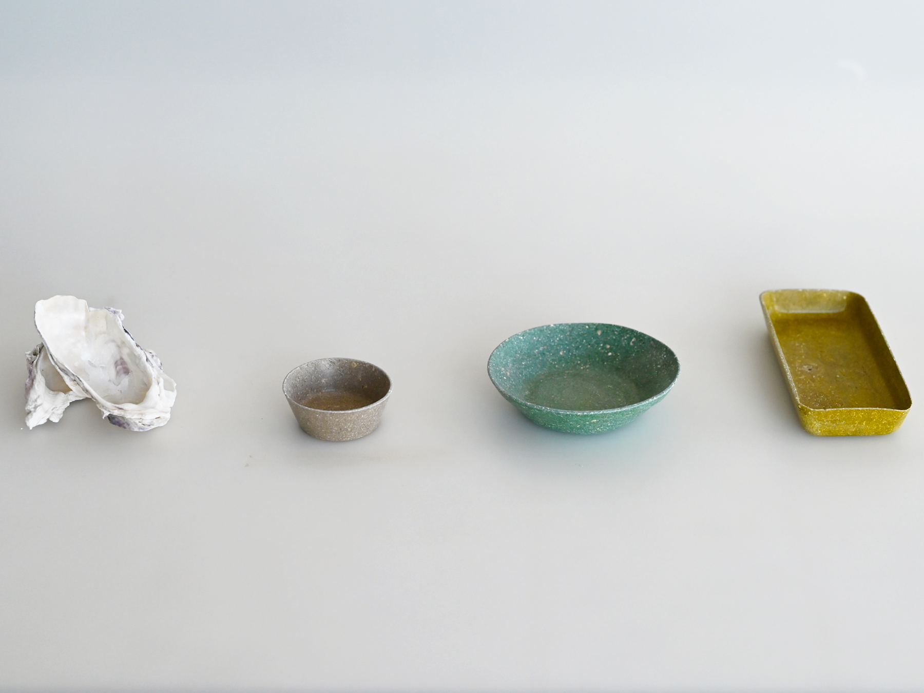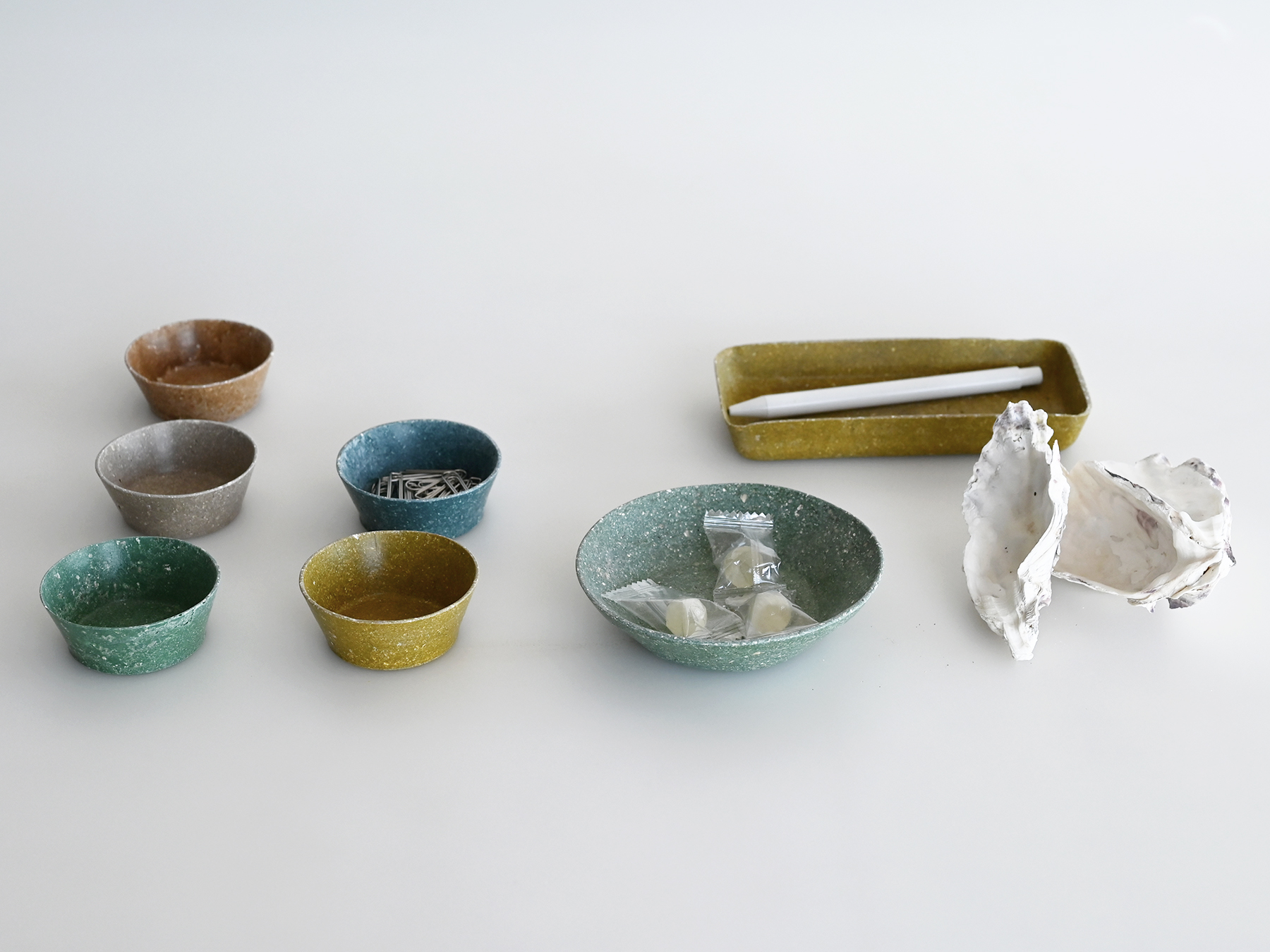 牡蠣養殖の廃棄物として大量に発生する牡蠣殻は、処理コストや環境面で課題となっている。再資源化は進められているものの、日用品への活用は少なく、牡蠣殻の含有率が5割以下の製品が多い。本制作では、牡蠣殻と大学の授業やゼミ活動で廃棄されるポリプロピレンシート(PP)を7:3で用い、熱プレス整形によって日常で使える容器を制作した。