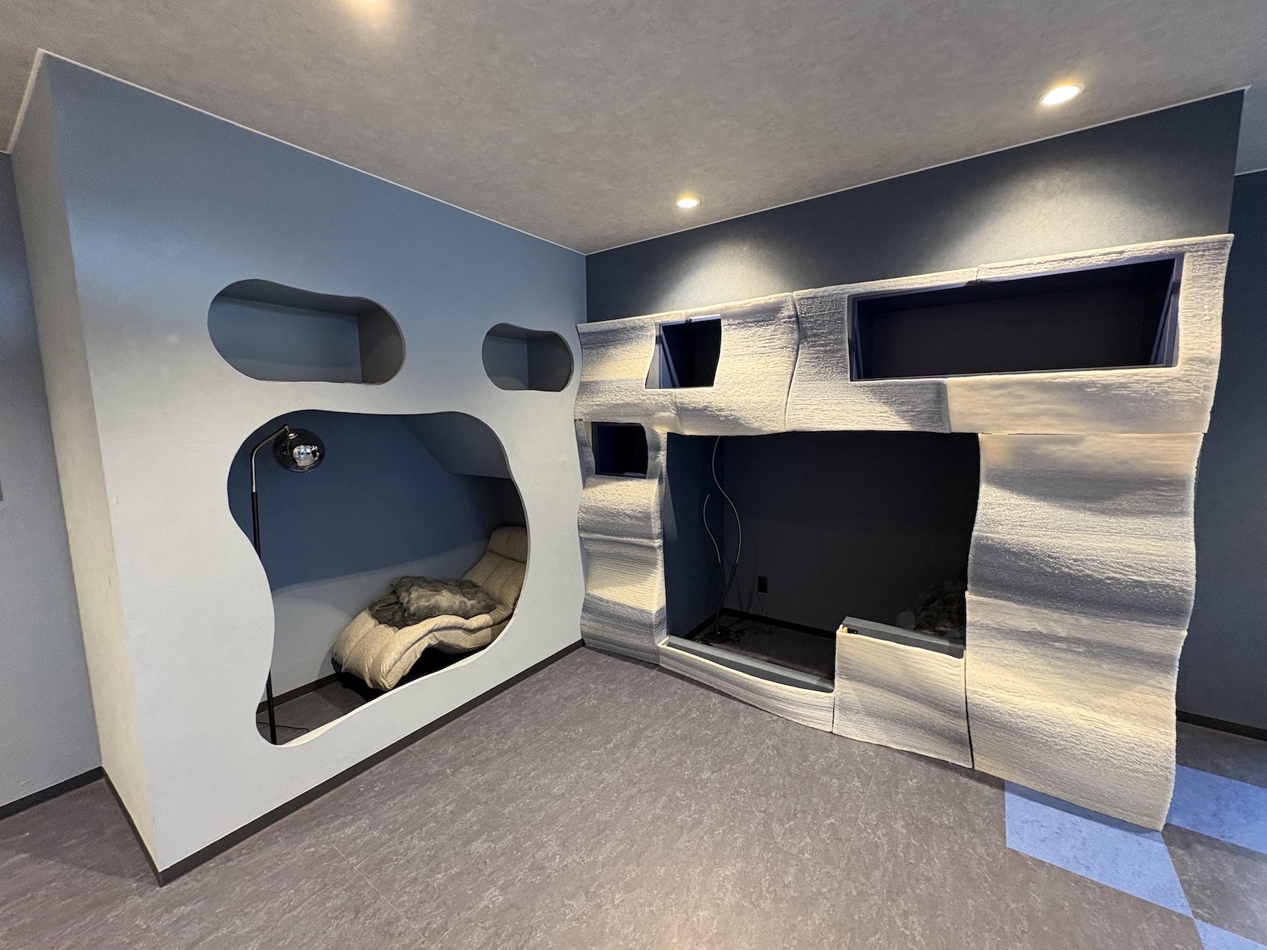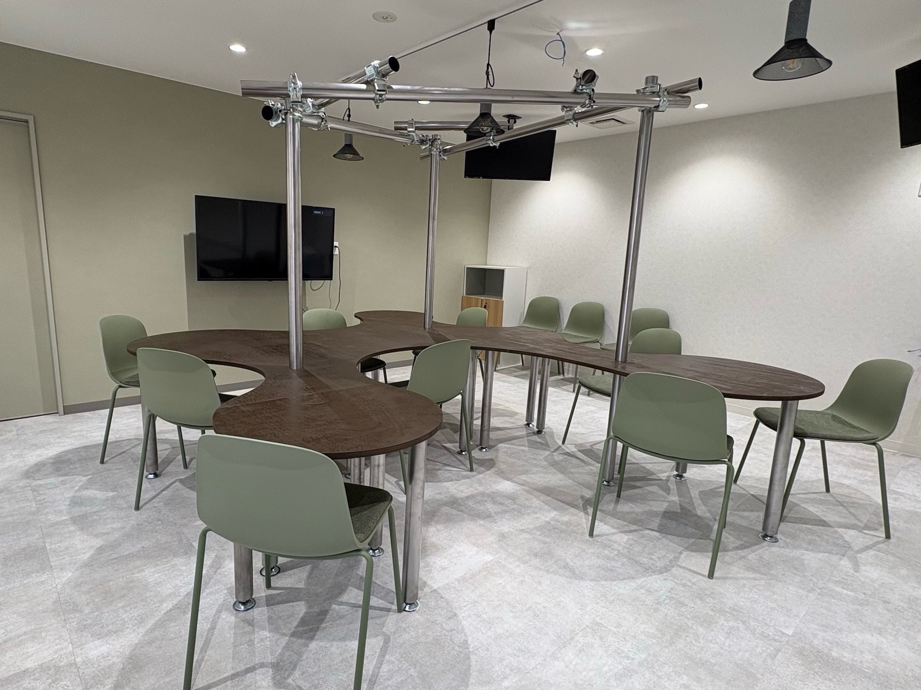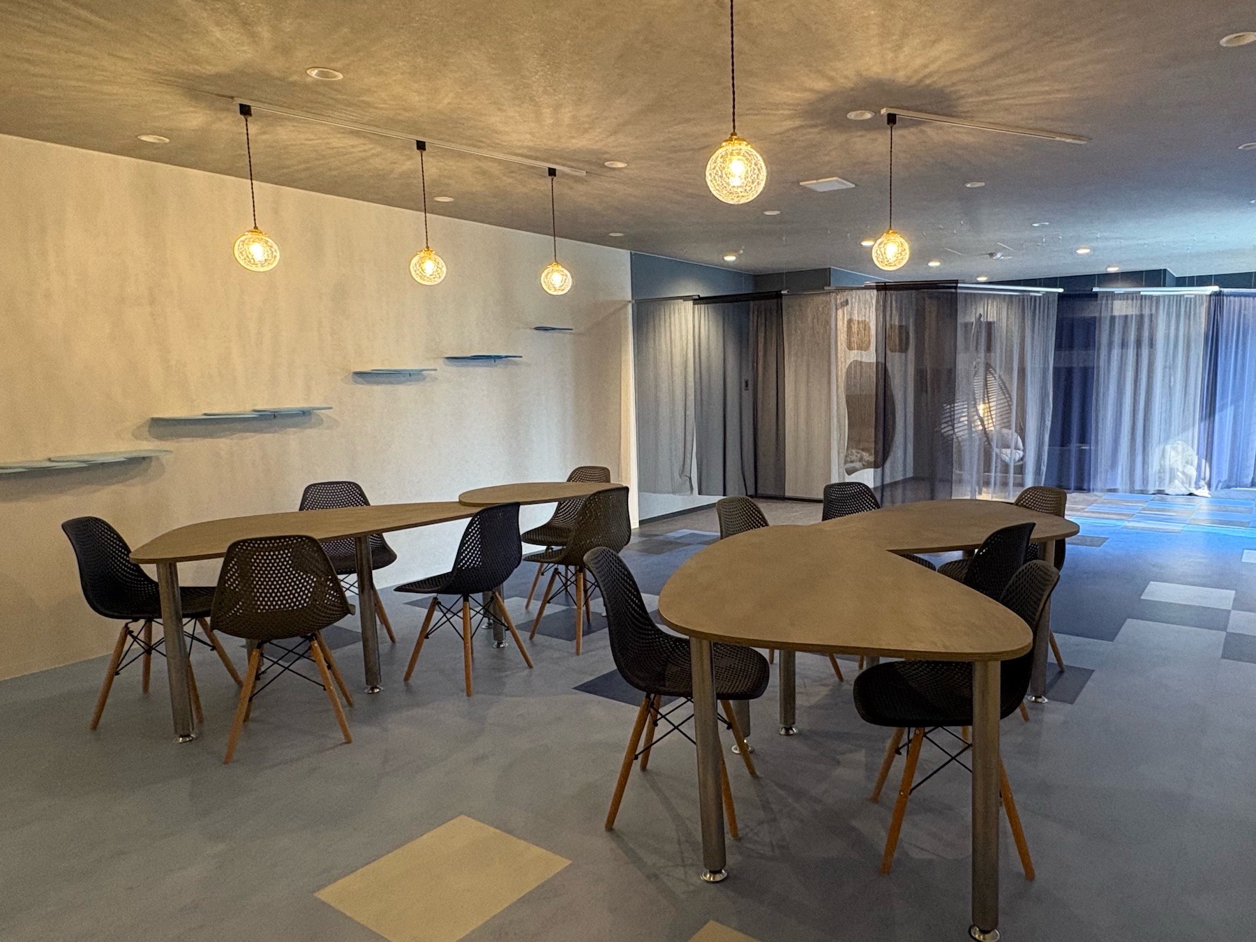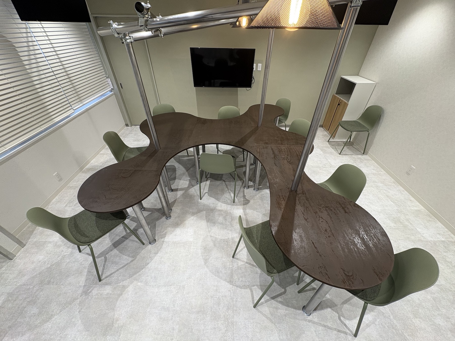 パイプ製造会社であるシンニチ⼯業株式会社の⾷堂と会議室のリノベーションを⾏なった。植物廃棄物を利⽤してサスティナブルなインテリアを提案する株式会社 spacewasp とも協働し、 家具や装飾で活⽤した。何度も打ち合わせを⾏いながらデザイン ・設計をし、⾃主施⼯を多く取り⼊れながら空間を創り上げた。「真のリフレッシュ空間」「新しい会議の形」とは何なのかを考え尽くした新しい世界が広がる。