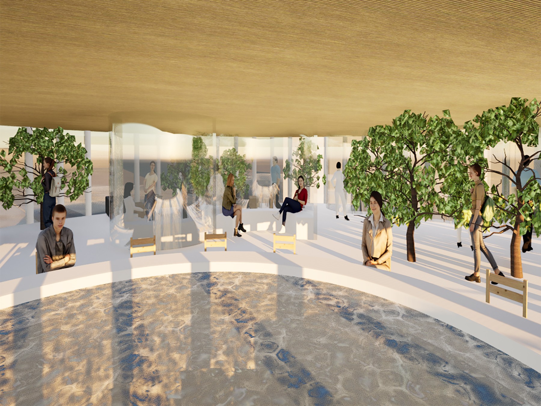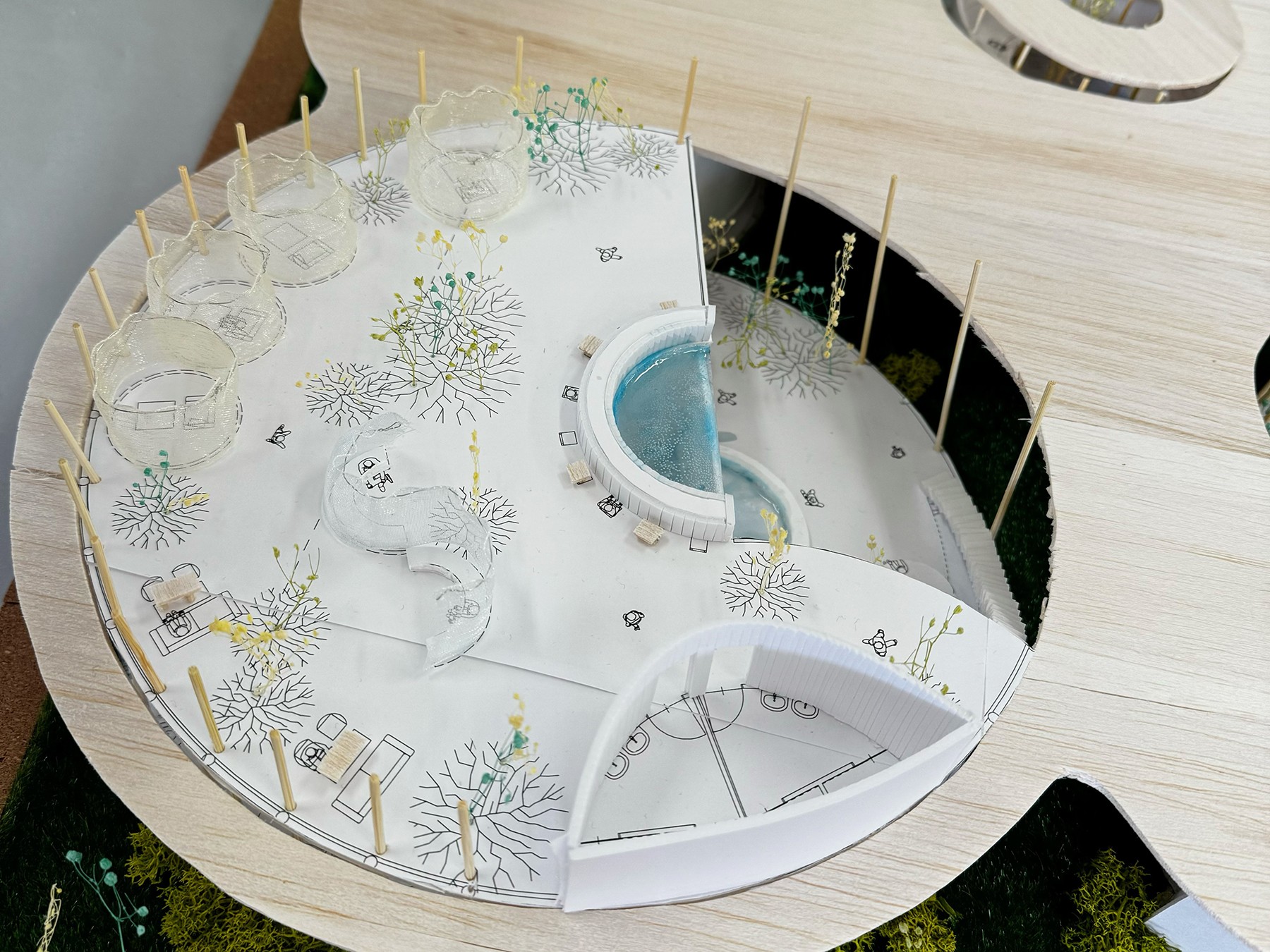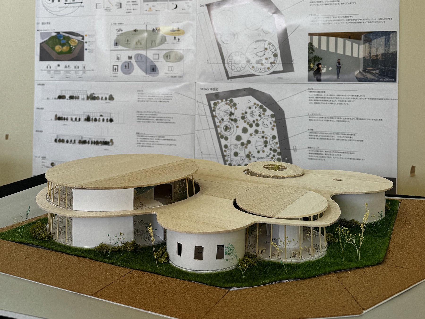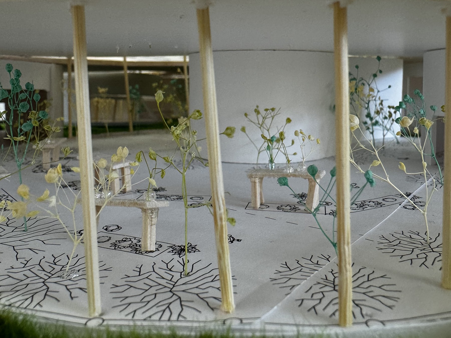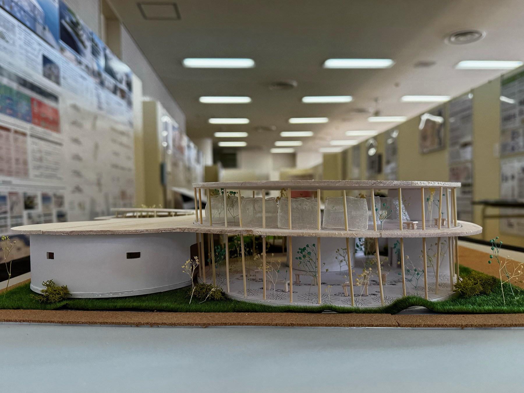 本研究は、木漏れ日などのバイオフィリック・デザインを用いたリトリート空間(憩いの場)の設計です。空間の仕切り方を工夫することで、他者の視線が気になる方でも落ち着いて過ごせる空間を提案しました。木漏れ日には心身を癒す効果があり、光の移ろいと共に空間の雰囲気や心情も変化します。交流が苦手な人を対象としており、訪れた人々が“今よりも少しだけ交流にポジティブになれる”ことを目的としています。