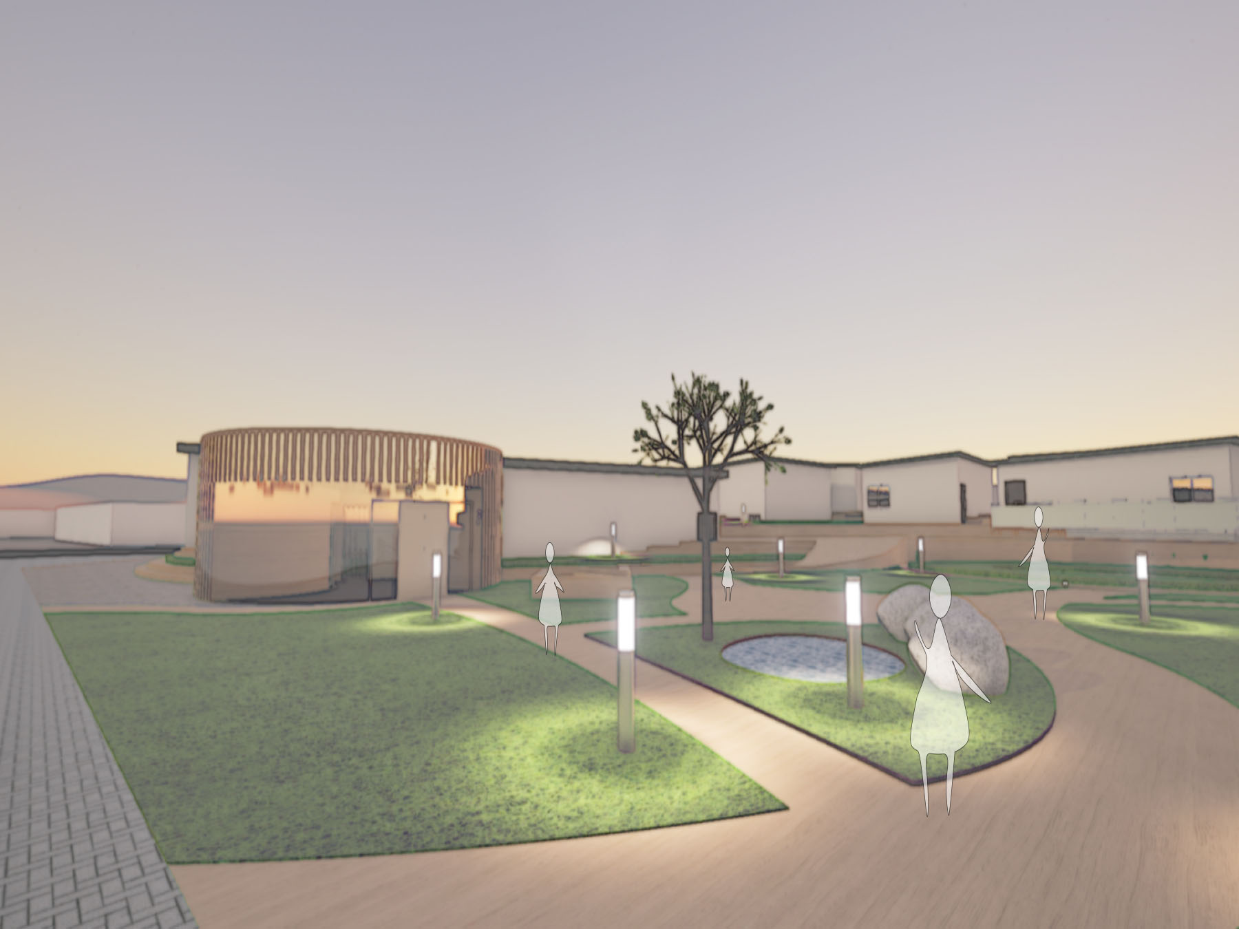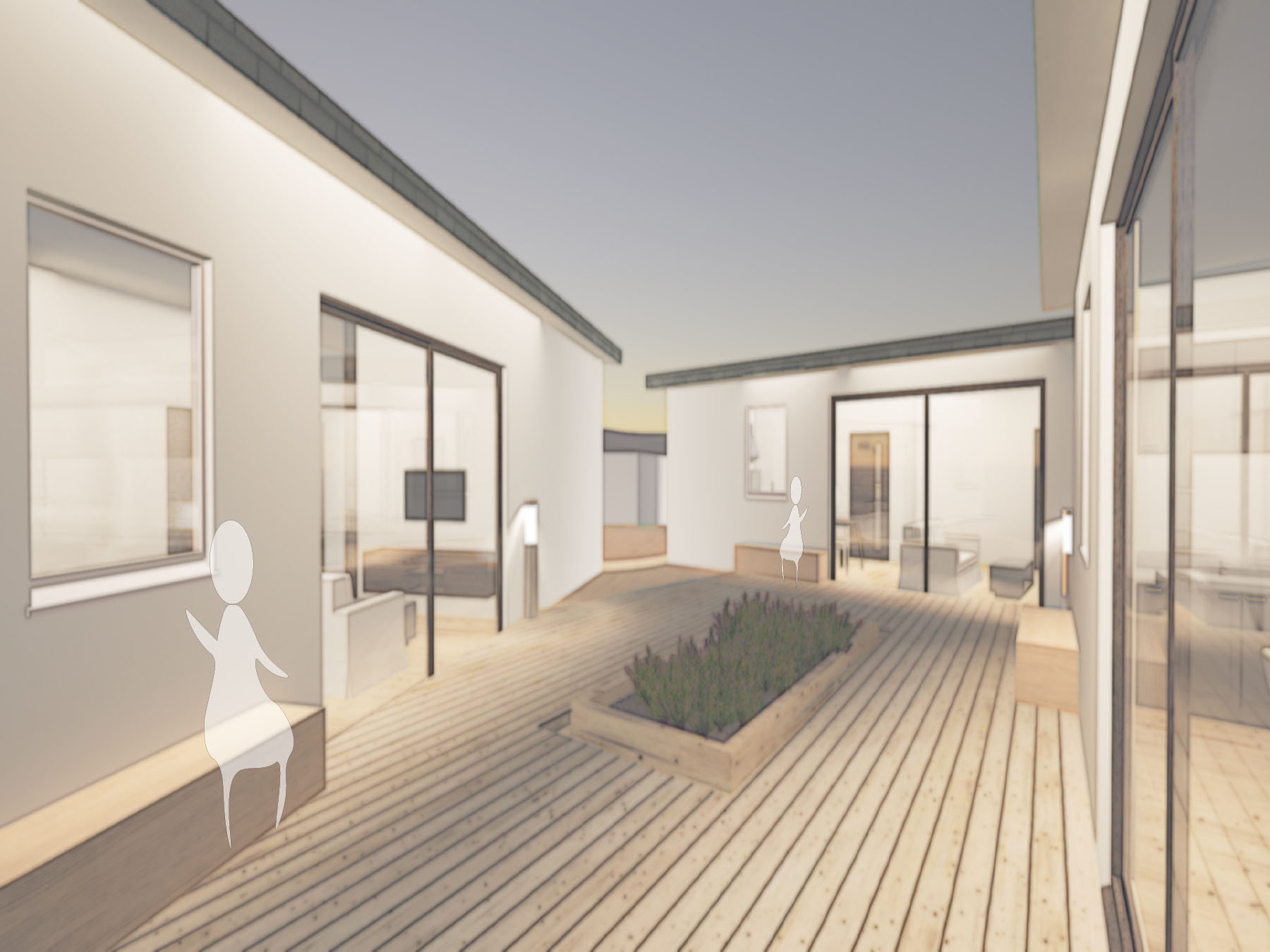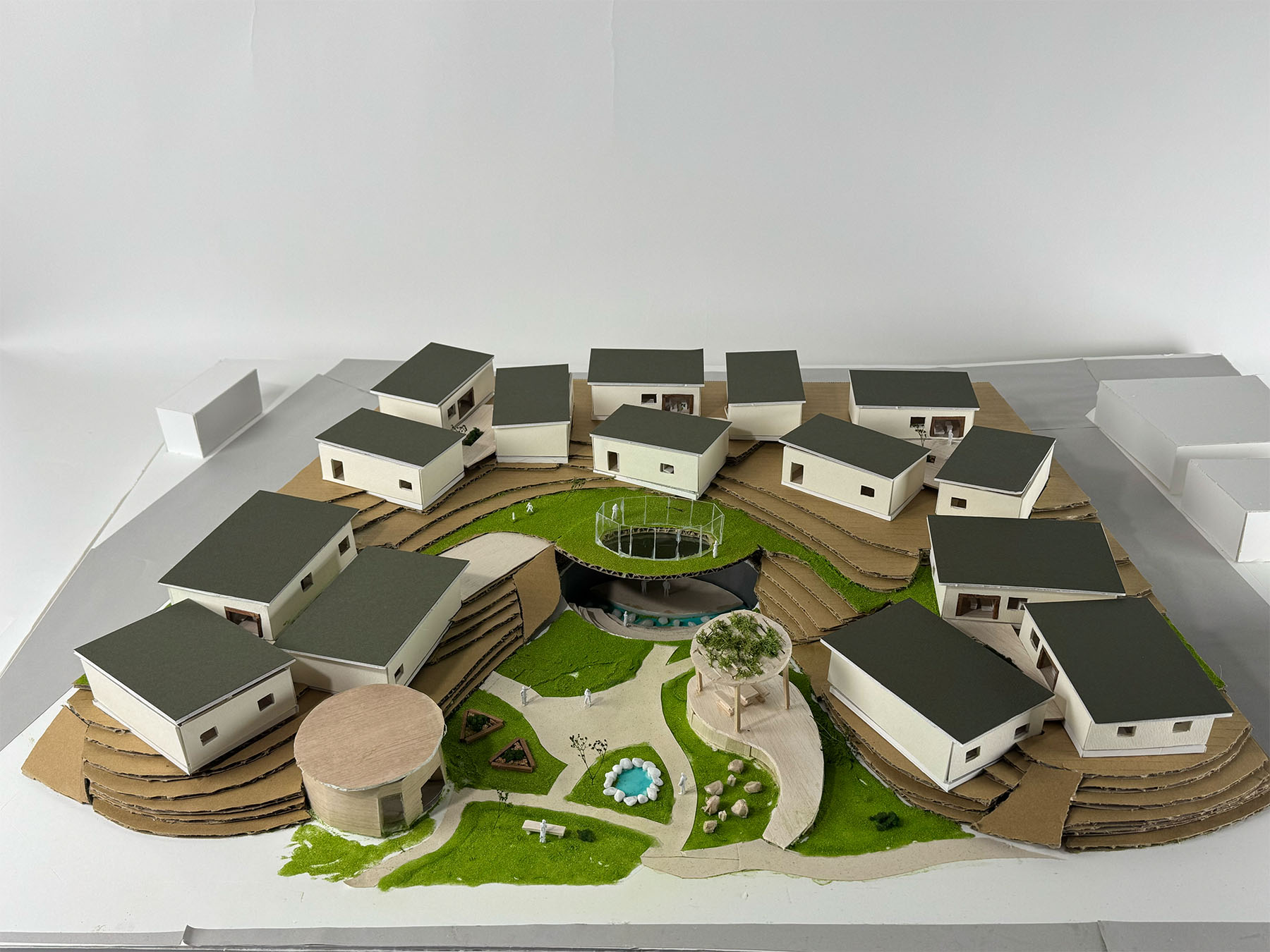 ひとり親世帯・単身高齢者・単身世帯の増加により深まる社会的孤立に対し、音楽療法の考え方を取り入れた住宅型交流拠点を提案する。音楽を特別なイベントとして切り離すのではなく、生活空間に組み込むことで、日常の中で自然に交流が生まれる環境を目指した。三戸一組の住居とウッドデッキ状の共用空間を核に、敷地中央には沈み込む音楽交流広場を配置し、水や環境音を取り組むことで心身の緊張を和らげる。さらに地域に開かれた広場や相談窓口を併設し、住民と地域が緩やかにつながる場を形成する。