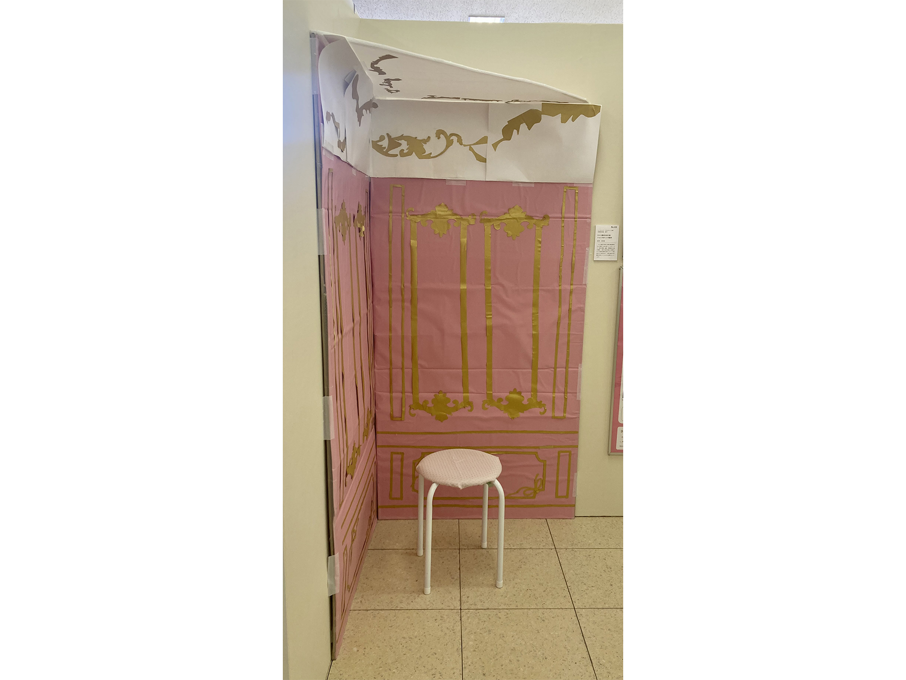 ロココ様式の思想と空間の構成要素をもとに制作した没入型フォトスポットです。色彩や装飾、曲線、空間構成を文献か整理し、試作と改良を重ねて本質的なロココ空間の再現を目指しました。表面的なロココ風ではなく、様式の魅力を体験的に味わっていただける空間となっています。
