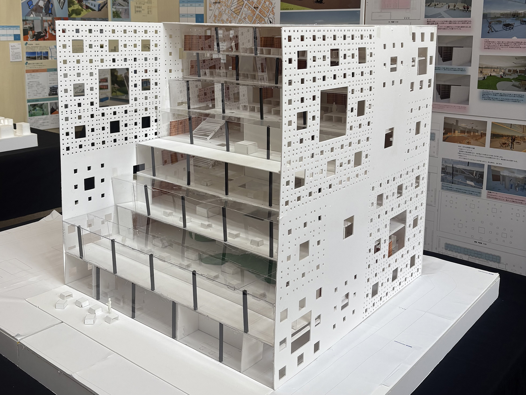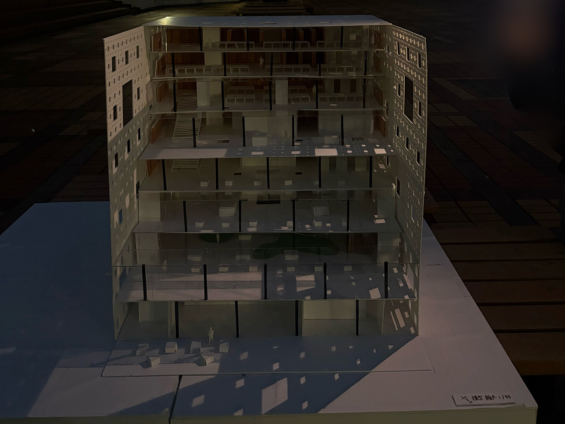愛知県安城市アンフォーレ周辺を敷地に、多数の人々が心地よく過ごせる立体的な図書館を計画した。吹き抜けやテラスから自然光を柔らかく取り込み、時間と共に移ろう光が空間に豊かな教条を与える。フラクタル的な構造を用い、小さな居場所が階層的に連続しながら広がることで学習や交流、滞在が自然に重なり合う心地よい公共空間を提案する。