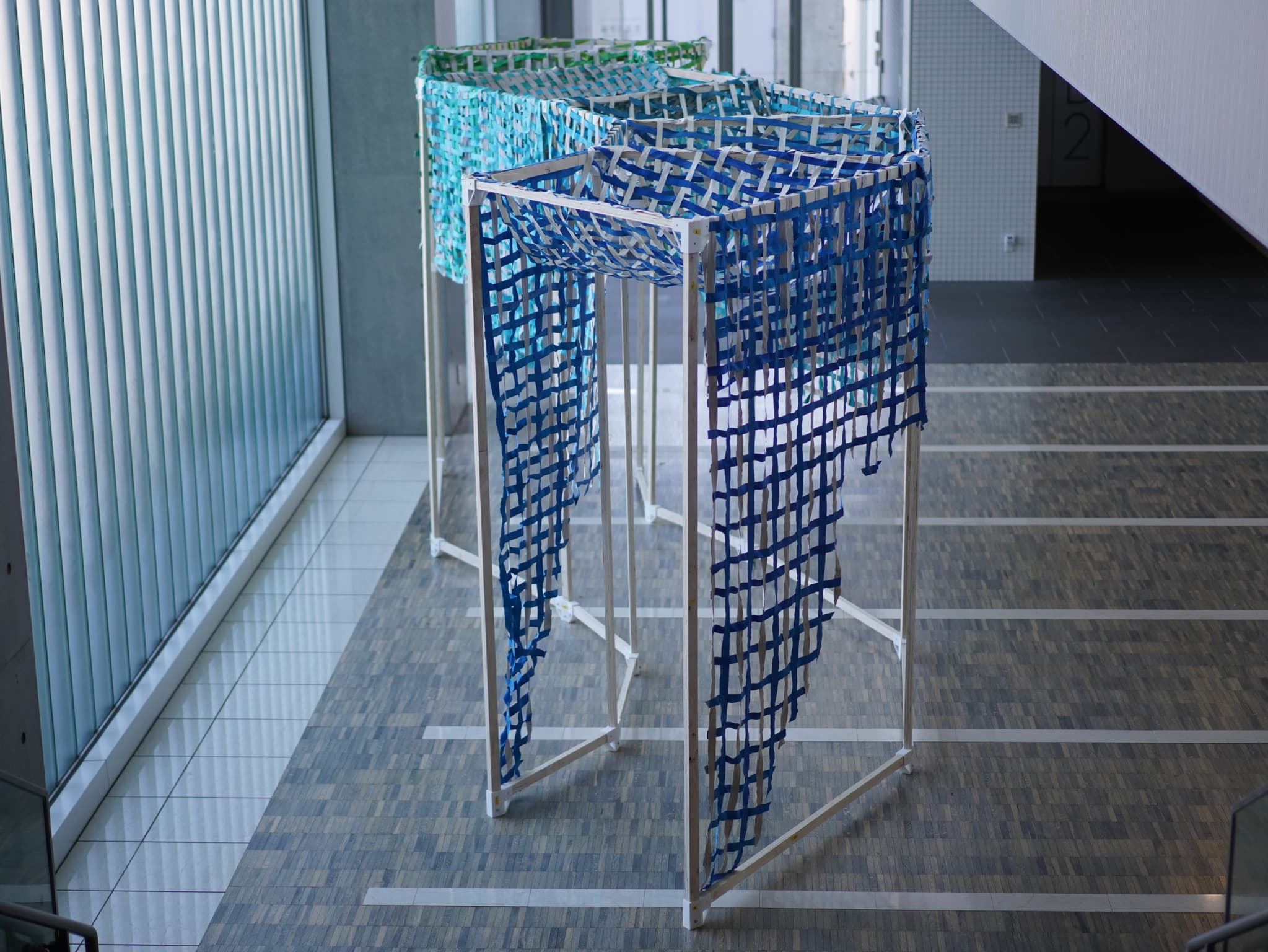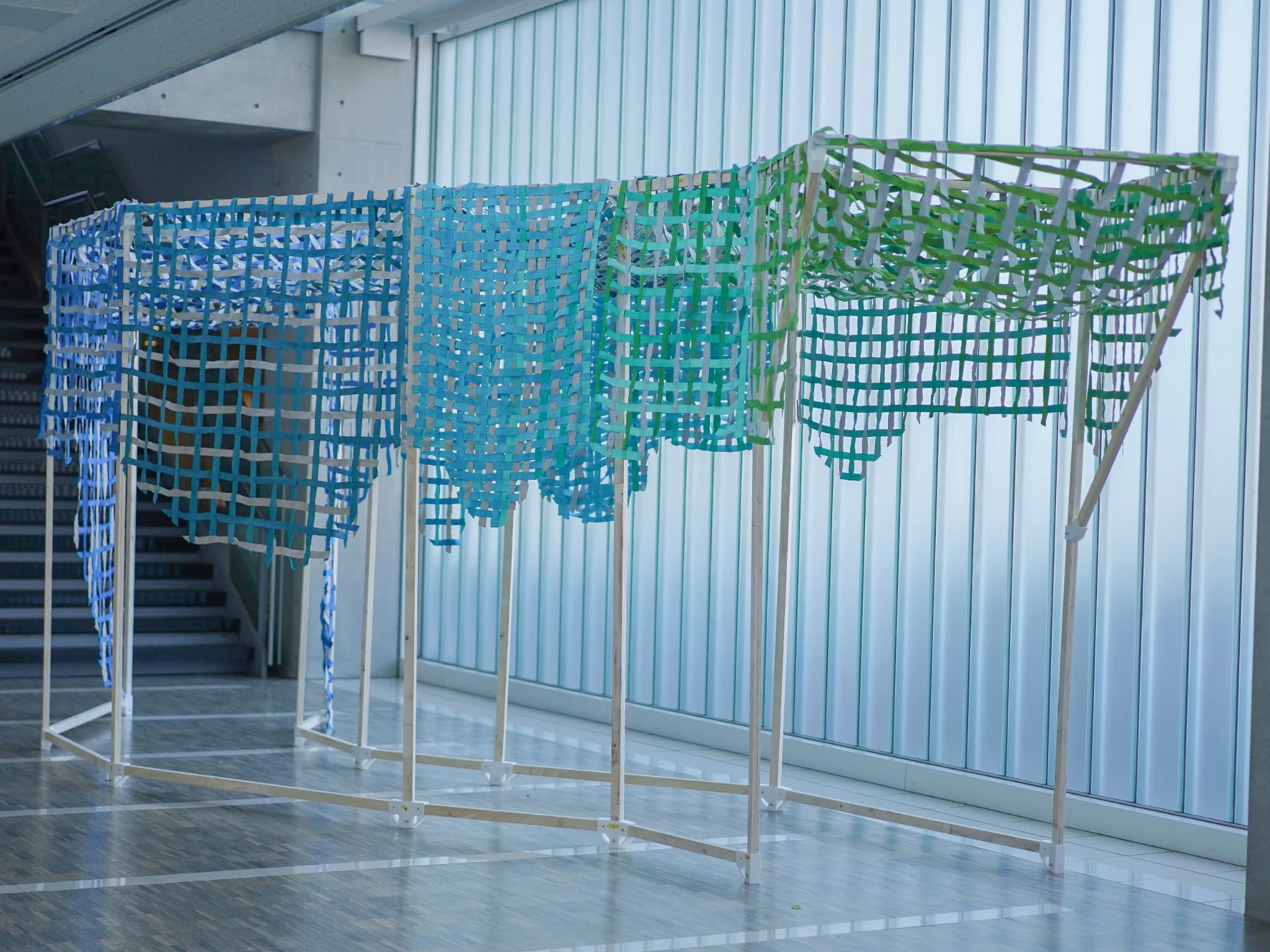 尾州は愛知県一宮市、岐阜県羽島市を中心とする日本有数の繊維産地であり、現在も国内毛織物生産の約8割を占めている。産地として栄えた理由に木曽川がもたらす自然のめぐみが関わっており、木曽川は水質が良く硬度の低い軟水で、染色や仕上げに適している。一方、生産過程において発生する残布や残糸などが増加し、それらの大量廃棄が環境問題として課題となっている。そこで尾州では毛七というリサイクルウール生地を作り、サステナブルな取り組みを行っている。本制作でも、廃材である生地と織りを活用して、生地づくりと毛七の流れを木曽川の流れに見立てた空間を提案する。