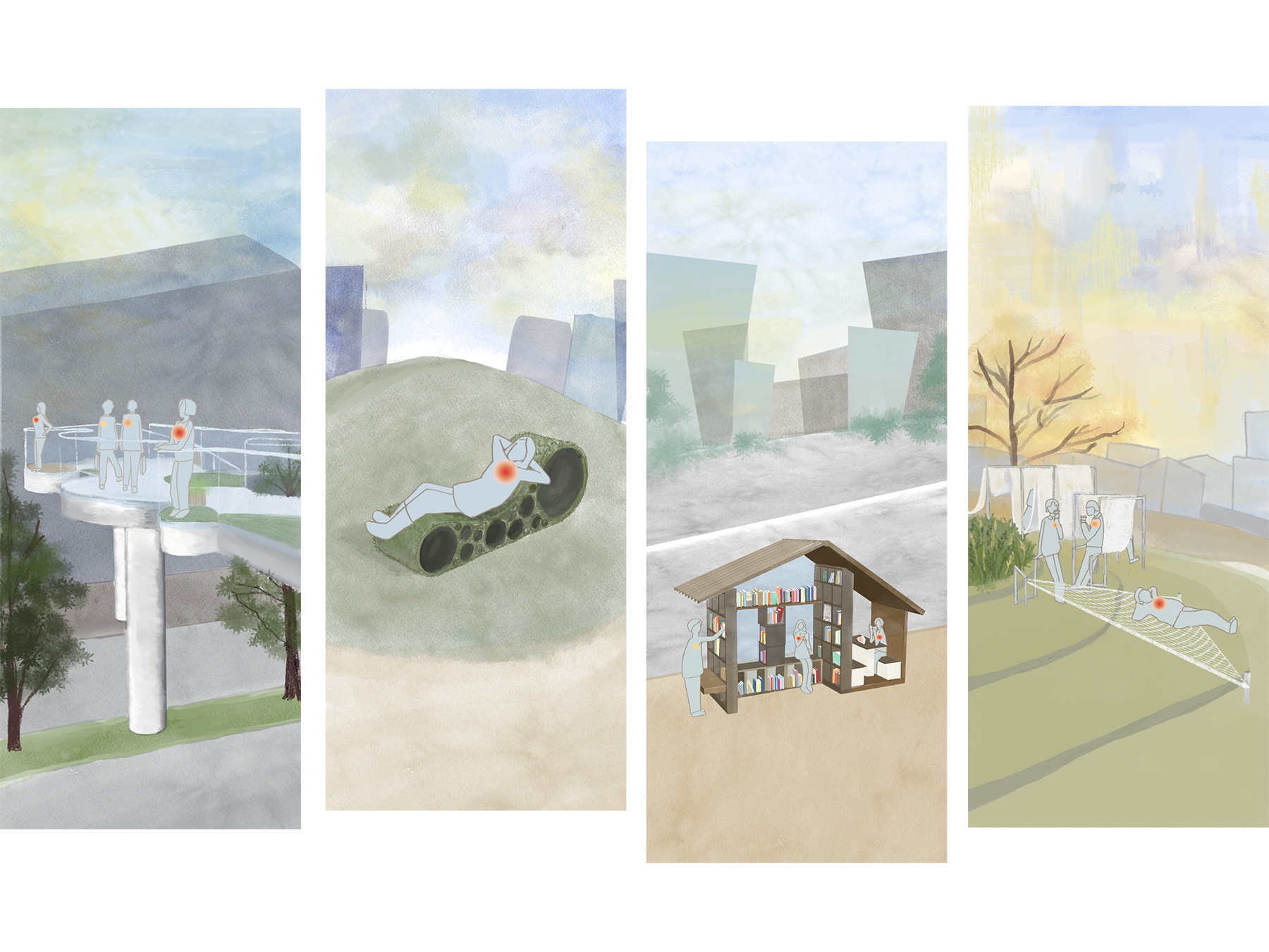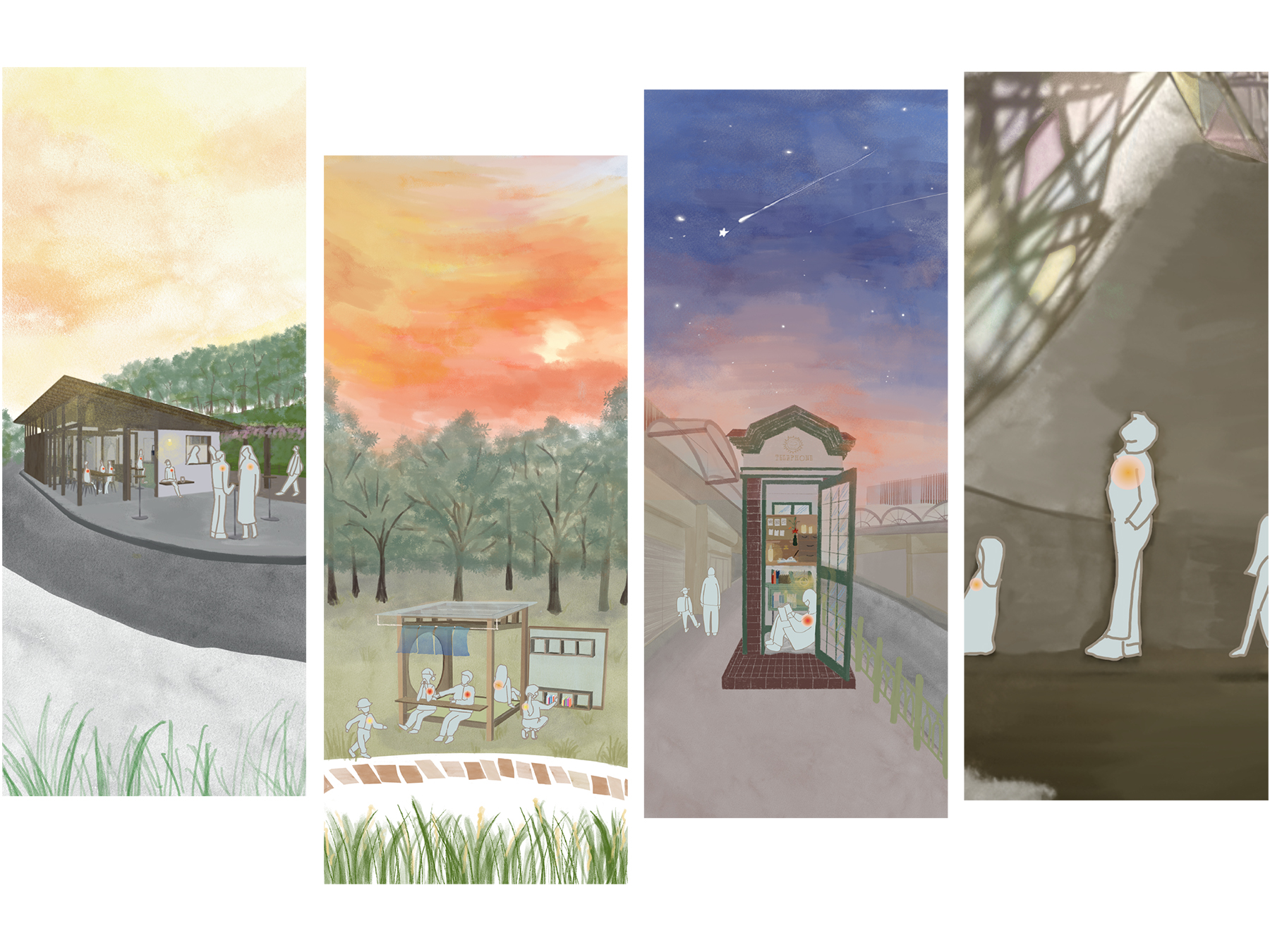 さまざまな要因から⽣まれるストレスが⼼に蓄積していく。それが溢れないように溜まったストレスがほろりと剥がれ落ちることを「ココロほろり」と名づけた。小さな仕掛けから空間まで、多様な要素を街にちりばめ、心の状態に合わせて選択する。⽇常の流れの中に「ココロほろり」という余⽩を挿⼊し、⼈と都市をやさしく編み直す設計があなたのまちにも広がっていく…